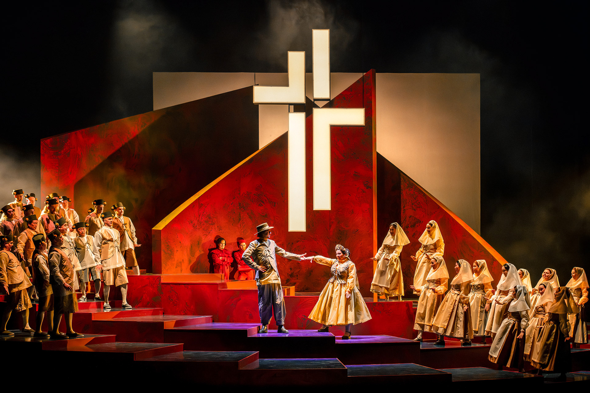 Über allem thront ein fragmentiertes Neonkreuz, das ähnlich gebeutelt wird wie die Würde der Frauen, die Don Giovanni als Eroberung sammelt wie andere Briefmarken. Sein Diener Leporello führt akribisch Buch: mal jung, mal alt, im Sommer die Dünnen und im Winter die Dicken. Mal freiwillig bezirzt und mal mit sexueller Gewalt. Alles ein Spaß, zumindest für Don Giovanni, uneinsichtig bis zum Schluss. Wer da an die Missbrauchs-Akten der vergangenen Jahre denkt, liegt nicht ganz falsch.
